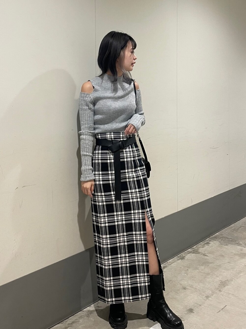 綺麗モノトーンコーデ♡【トップス】ショルダーのあきかんがさりげない1枚♡アウター脱いだ室内でおしゃれ見え抜群◎タイトですが腕の縦リブが二の腕を細見えさせてくれます。【スカート】164センチSサイズでアンクルまでくるロング丈。高身長の方にも◎小柄な方にもスリットがスッキリ見せてくれるので厚底ブーツ合わせでもたつき感なく綺麗に着用出来ます。【靴】めちゃくちゃ軽いです!!スタッフの子たちは全員もっているかも?ってくらいEMODA内でもとても人気です(笑)サイズ感は23.5の24よりでMサイズ履いております。