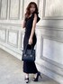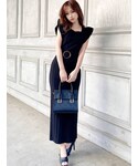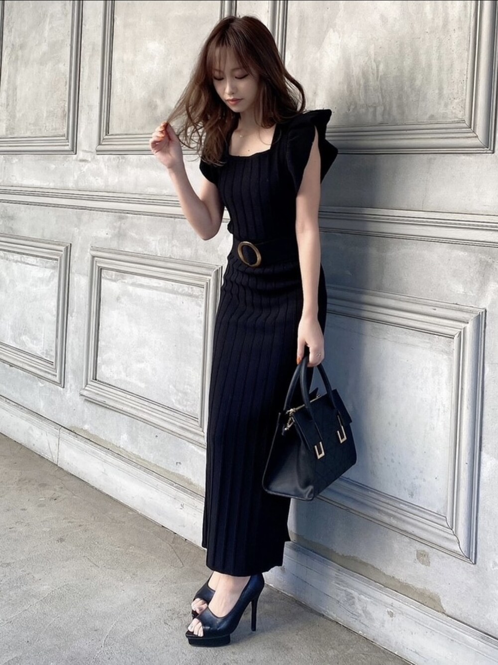 袖のラッフルで気になる肩回りや二の腕カバー◎ ウエストのリブとストライプに入った配色で程よい抜け感に♪ ベルト付きなので1枚でスタイルアップ! 小物もオールブラックで統一☺︎