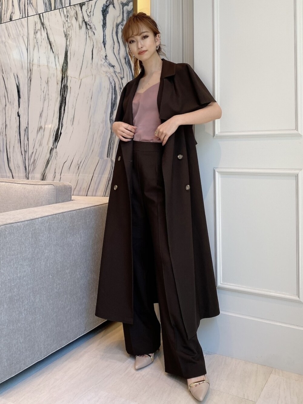 ケープコートはセットアップのパンツと合わせてクールに! 前を閉じてワンピ風に着てもとってもかわいい❤︎ キャミソールと合わせてスッキリ見せるのがオススメ♪