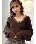 シンプルなデザインながらも襟元にさりげなくレースがあったりと女性らしさ溢れるニットトップス! クロップド丈で重たくなりすぎずに着用でき、タイトボトムとの相性◎