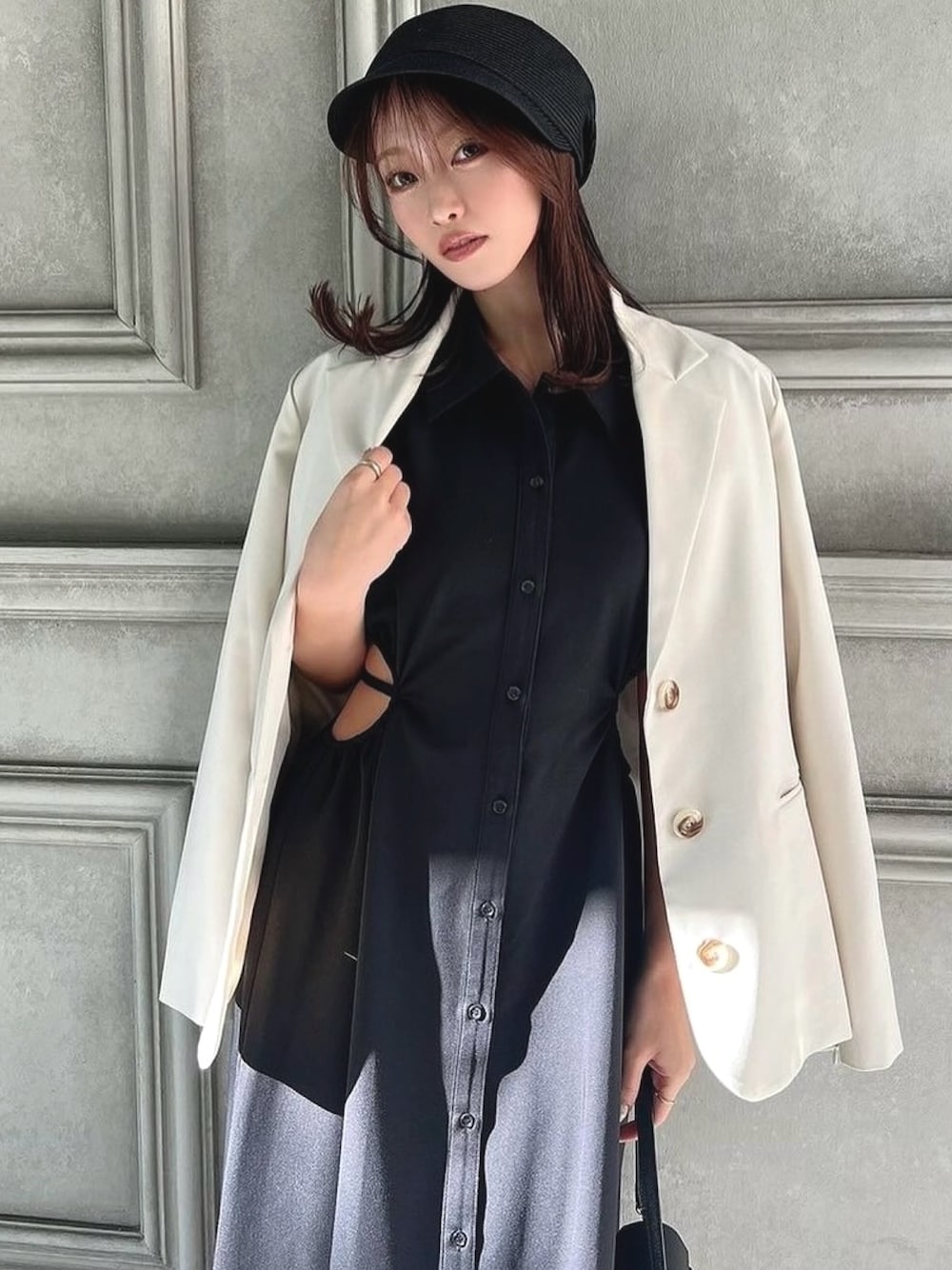 サイドがカットアウトデザインになっており、程よい肌見せが叶う女性らしいシャツワンピース♡ 綺麗なボディラインを魅せることが出来る+バックリボンで後ろ姿まで可愛らしく♪ 春はジャケット合わせもおすすめ!