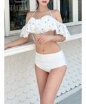 しっかりめのパッド入りで盛れ度◎ オフショルデザインで気になる二の腕周りはカバー出来る♪ バックリボンと花柄がかわいらしさをプラス! ボトムスはリバーシブルで着用出来るので、花柄と無地お好きな方で◎ ハイウエストなのでお腹周りやヒップのカバーも!