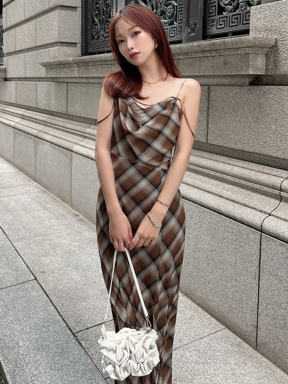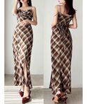 晩夏にイチオシのチェックキャミワンピース♪ ドレープデザインとウエストのメリハリ、マーメイドの広がりのコントラストが美しいデザイン♡ リボンでウエストのサイズ調整が可能◎ スリット入りなので歩きやすく、歩くたびに足がチラッと見え抜け感をプラス!