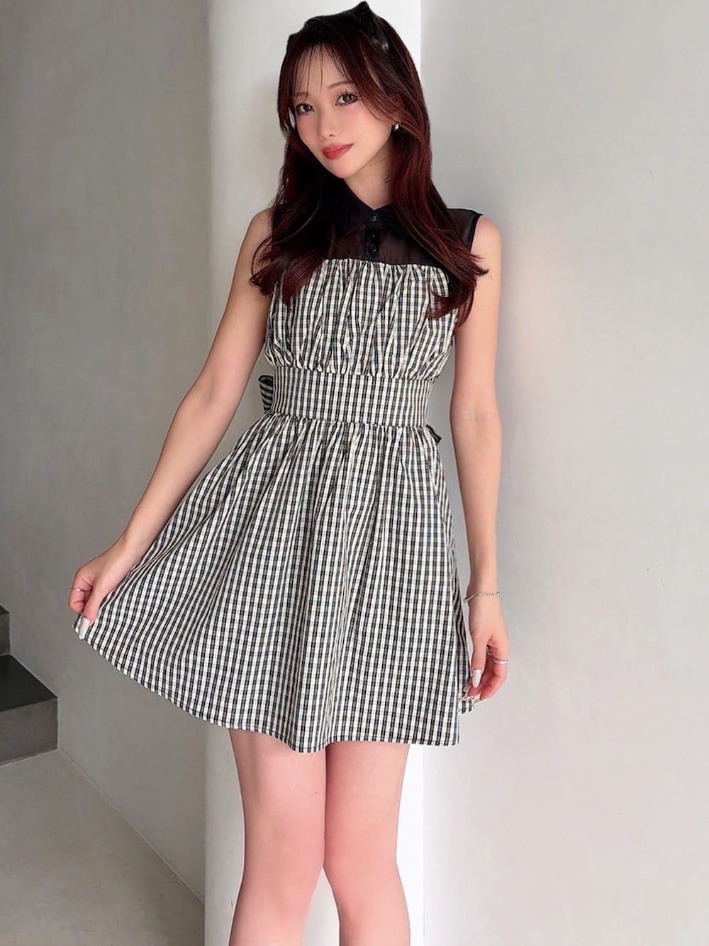 ハリ感のある生地を使用したことでギャザーをしっかり表現し、デザイン性のあるミニワンピース♡ デコルテ部分はシアー素材になっているので透け感が夏らしさUP! ウエストにリボンを付けているのでウエストのサイズ調節が可能◎ 大きめのリボンで後ろ姿まで可愛いデザインです♪