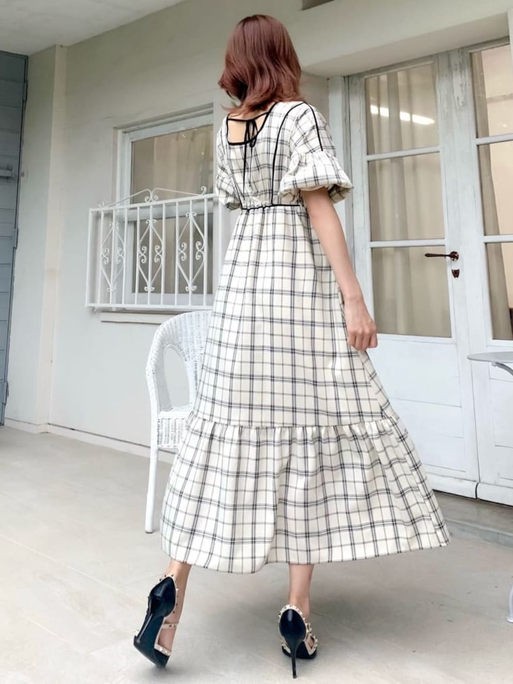 トレンドのチェック柄がかわいいフレアワンピース♡高身長さんでも安心して着れるロング丈です!ほどよい背中あきのバックデザインなので、アラサーの私でも着やすい1枚♪ウエストマークはしっかりありつつ、ウエストから下はゆったりとしたボリューム感のあるデザインなので、ご飯をたくさん食べても大丈夫なところも嬉しいポイントです!!二の腕もしっかり隠れるので体型カバーもしてくれます♪暑いけど秋服が着たいときにぴったりなワンピースなので今から秋にかけて大活躍間違いなし♡