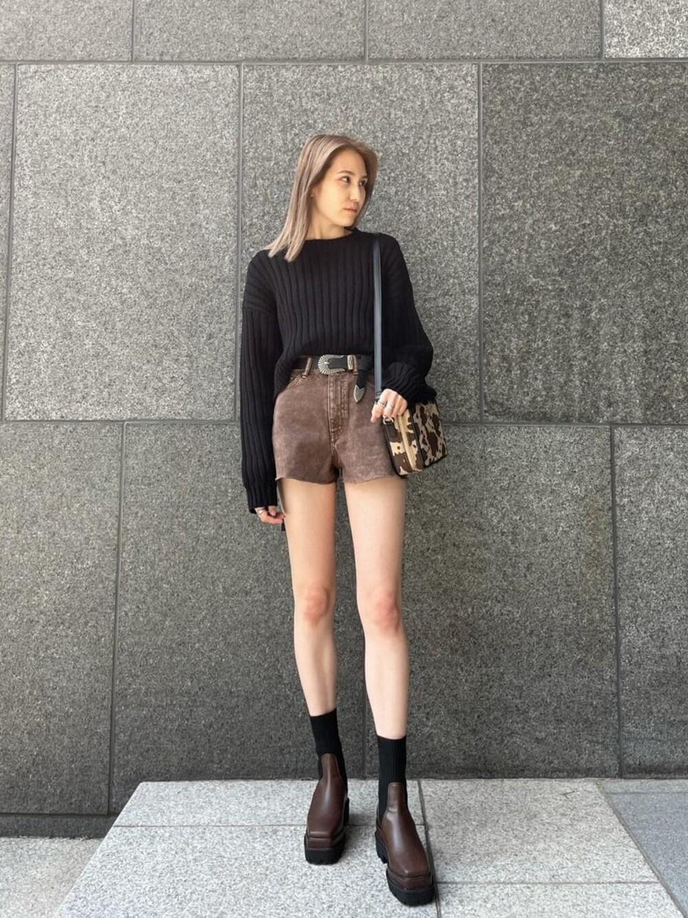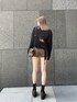 【秋でも出来る!肌見せコーデ♡】 程よい肌見せとショーパン合わせで抜け感たっぷりの秋コーデです☺︎ニットは大きめのシルエットですが、丈感短めで縦リブが入っているのですっきり着て頂けます!バックオープンですが、下着が見えないラインに作られているのも着やすいポイントです!大人気のショーパンは台形シルエットなので太ももが細く見えて、ハイウエストなので脚長効果バツグンです◎ブーツはニット素材がドッキングされているので、デザイン性と履き心地どちらも兼ね備えてる最強アイテムです!ブラックとブラウンのダークカラーの中にアニマル柄のバックが映えてコーデのポイントになってくれます☺︎