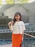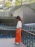 オレンジコーデ トップス→骨盤まであるジャスト丈なのでどんなボトムスでも合わせやすいです! ゆるっとしたシルエットで袖も長めになっているので体型カバーしてくれます! スカート→中にショートパンツが付いています!ロング丈のスカートでも深めにスリットが入っているのでスッキリとした印象になり、夏でも涼しく履けます! シューズ→ジェイダ定番の大人気ミュール!どんなコーデにも合う万能シューズです!先端が細長くなっているので足をすらっと長く見せてくれます!