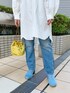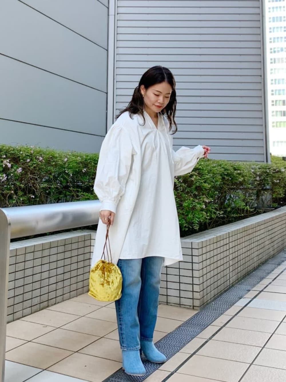 1枚ではもちろん、パンツ合わせでも可愛いスキッパーワンピース✴︎ ワンピースのフレアシルエットを活かし、ボトムは コンパクトめなパンツを合わせることでバランス◎です☺︎ 秋小物でで差し色するとシーズンムードがでておすすめです❤︎ バイカラーのデニムが前後で印象を変えてくれるので様々なコーデにはまりやすいですよ♪ 小柄さんでもすっきり着れる着丈がいちおしポイントです!