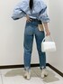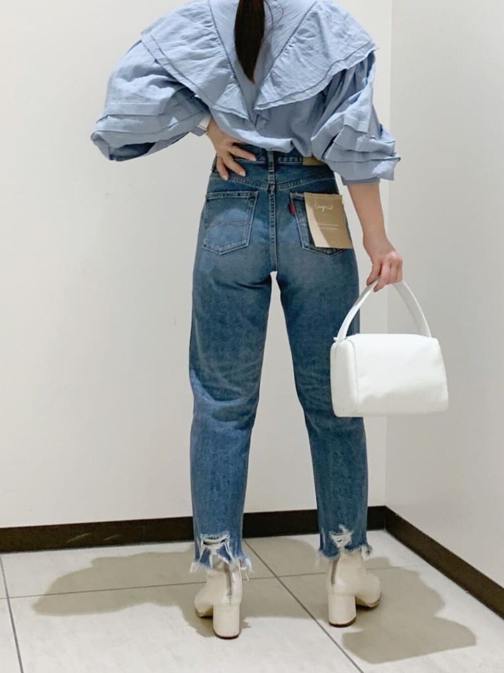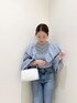 春のブラウス×デニムコーデ♡ 全体的にワントーンで、小物はホワイトですっきりと統一感を出すことで洗練されたイメージに☺︎ フリルがきいたブラウスと、裾にかけて細身になっているデニムの合わせでシルエットが逆三角形▼のシルエットになるので、自然と目線が上に上がり小柄さんでもすっきりした印象で着れます♪
