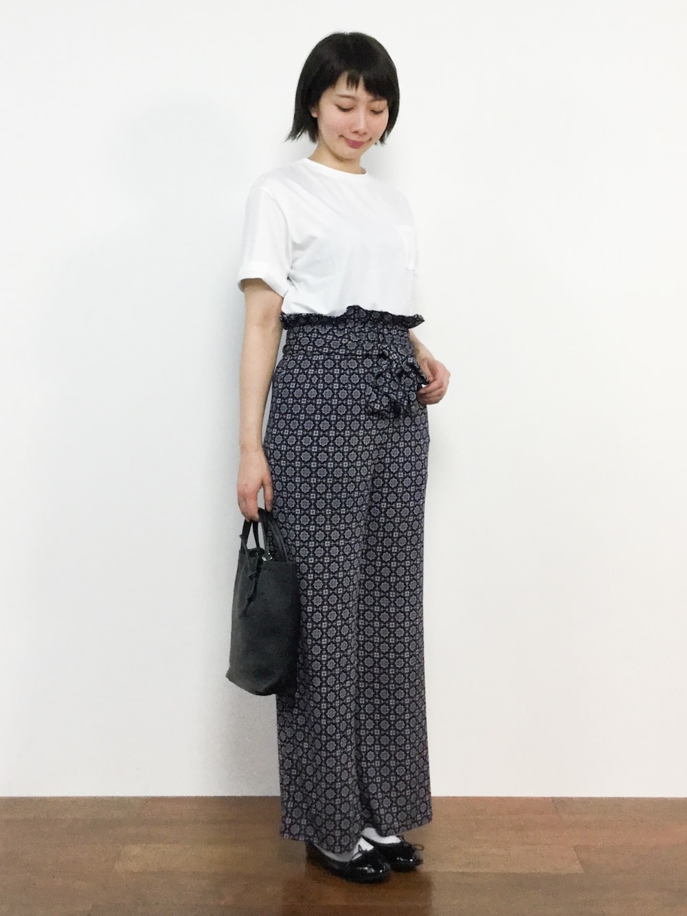 三由佳奈のその他パンツ「レトロタイル柄ワイドパンツ」を使ったコーディネート