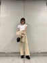 同素材合わせでセットアップ風コーデ❤︎カチッと見えするジャケットやフレアーパンツもインナーのTシャツや小物使いで、しっかりカジュアルダウン❤︎
