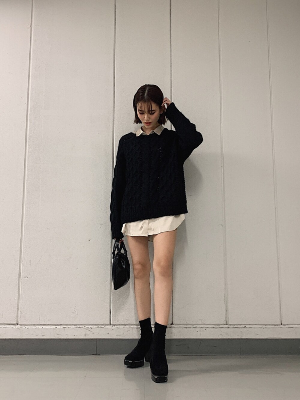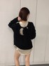 ざっくり編みのニットにサテンシャツをレイヤードし大人カジュアルな雰囲気に、、❤︎大きなバックリボンがポイント❤︎❤︎