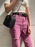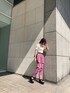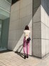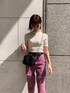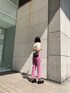 明るめな春カラーが可愛いコーデ❤︎パープルカラーのデニムって珍しいですよね!ヒップから太もも周りにかけてゆったり目なストレートシルエットがカジュアルな印象へ★高めなクラッシュ位置が脚長効果もバッチリ◎店舗でも大人気なトップスは前がシンプルなデザインなので、幅広いコーデに組み込んでもらえますよ❤︎小物は締め色のブラックで統一し、全体をバランス良く合わせてみました☺︎