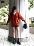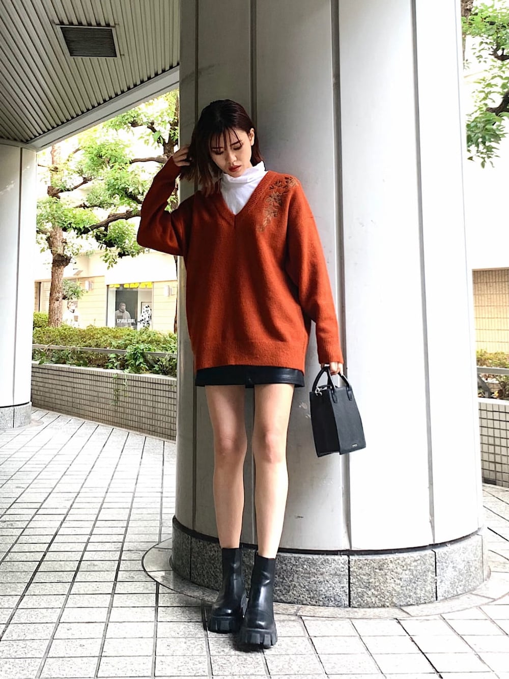 トレンドのオレンジカラーが目を惹くコーデ❤︎【ニット】同系色の刺繍が施された高級感溢れるニットは1枚でお洒落に❤︎首元が深めなVネックなので、冬はタートルネックのトップスなどとレイヤードして着合わせるのがオススメですよ!!166cmでヒップラインをカバー出来る程の長めな着丈なので、今回は女の子っぽくミニボトムで合わせワンピース風に着回して見ました❤︎【スカート】今季1着は必ずしも持っておきたいフェイクレザーのミニボトム❤︎インナーパンツ付きなので、ミニボトムに抵抗がお有り方でも安心して着用していただけます!