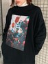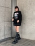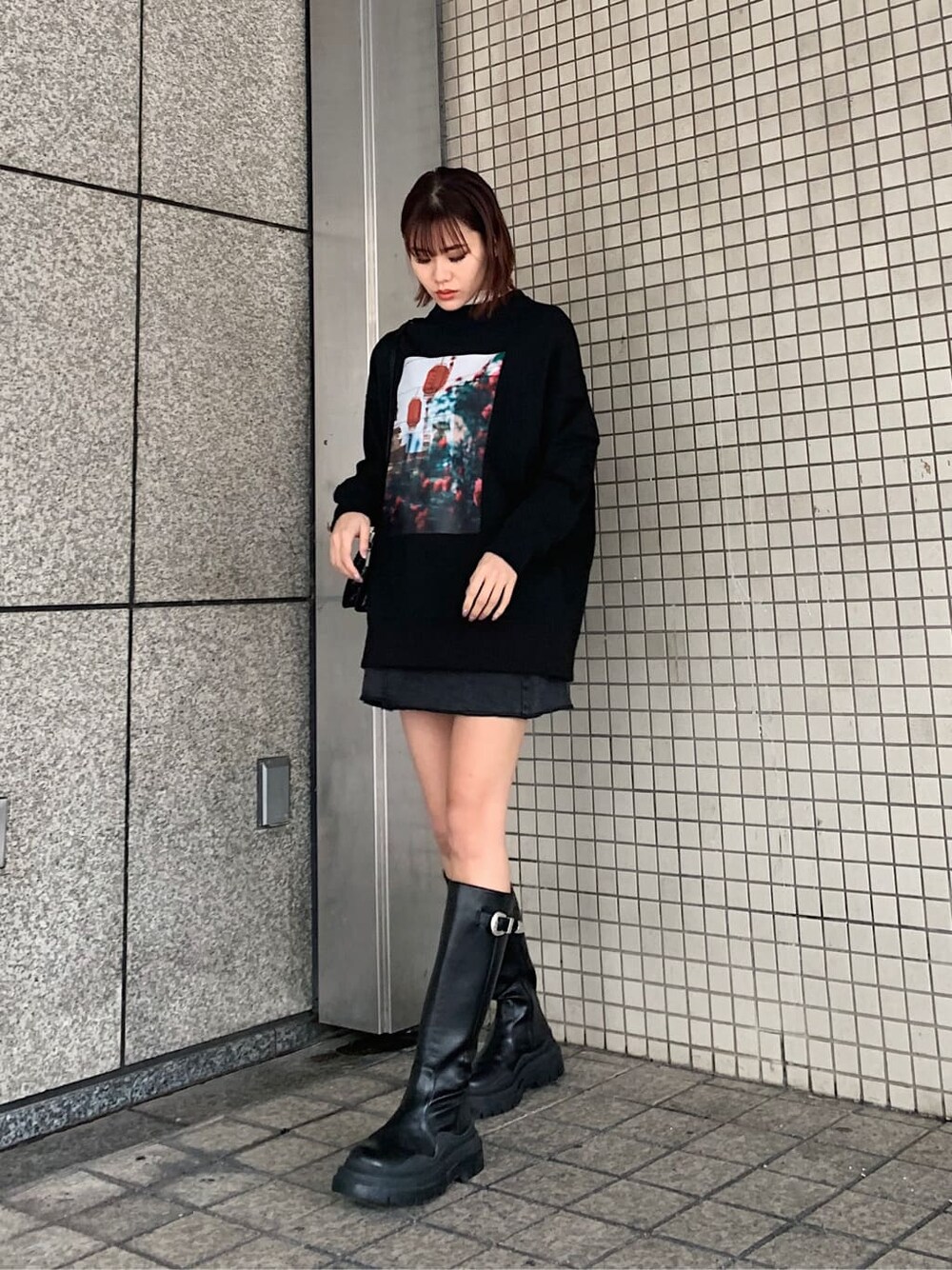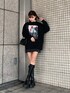 ブラックコーデ❤︎【トップス】今季トレンドのチャイナモチーフの遊び心あるフォトプリントが存在感抜群なスウェット❤︎両サイドポケット付で、ここ最近ミニバッグを持ち歩くケースが多いので助かるポイントに☺︎166cmでヒップラインに被さる程のオーバーサイズでラフに着用して頂けますよ!!【スカート】EVRISで定番人気の台形シルエットスカート❤︎ウエスト周りをスッキリ、裾広がりな分太もも周りをシャープに仕上げてくれます✴︎ケミカル風加工がオールブラックコーデに自然と抜け感を与えてくれますよ☺︎【ブーツ】5cmヒールが程良い高さで日常使いにも最適❤︎ベルテッドデザインがEVRISっぽく足元からエッジさをプラス!!