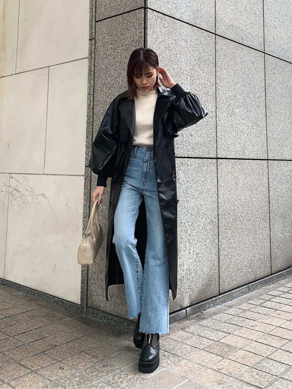 お気に入りのアウターを主役としたコーディネート❤︎❤︎【アウター】166cmでふくらはぎ下まで被さる程着丈がしっかり長めなコートでカッコいいオーラ全開❤︎お袖のボリュームあるシルエットがカチっとなり過ぎずカジュアルな印象に☺︎春アウターとして4月頃まで長く着回していただけます!【デニム】ピタッとし過ぎないセミフレアなシルエットが、脚のラインをカバーしつつも細見え効果抜群◎綿100%デニムで履き始めは固めですが、使用していくうちに自分好みな履き心地に変化していくのもオススメポイントです❤︎【バッグ】500mlのペットボトルもスッポリ収納可能なデザインだけじゃなく実用性も兼ね備わったなボストンバッグ❤︎