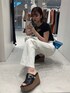 夏のモノトーンデニムコーデ❤︎【トップス】柔らかめなリブ地が着心地抜群◎伸縮性豊かなので首周りの着脱もベルトを外さずそのまま被れます!胸元のバックルと一部肌見せがアクセントになります❤︎【デニム】今季トレンドのスラッシュデニム❤︎太もも〜膝に掛けて少し細身なシルエットが美脚効果◎骨盤より数センチ上のハイウエストが脚の長さも盛れます✳︎【シューズ】EVRISらしいバックルデザインがエッジが効いててカッコ良いですよね❤︎アッパー裏はクッション仕様になっており、靴擦れ防止!11cmヒールですが、ウエッジソールの為安定感抜群です!【バッグ】ノベルティのバッグです❤︎
