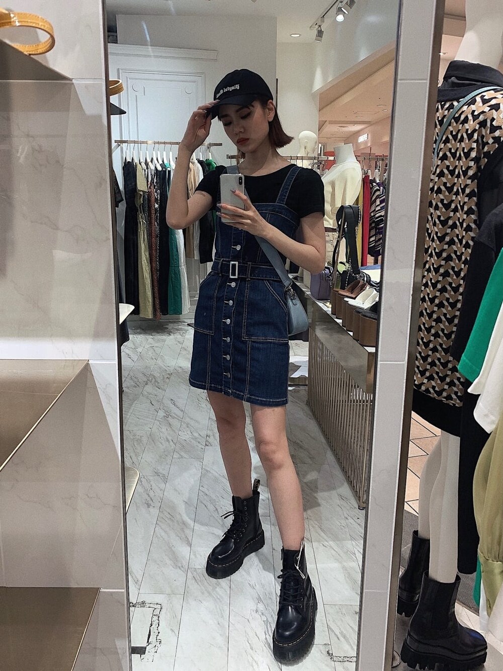 デニムジャンスカを使った甘辛MIXコーデ❤︎【ワンピース】タイトシルエットですが、伸縮性抜群なデニム地なので圧なく着て頂けます☺︎ストラップは長さ調節が可能です◎166cmSサイズ着用で太もも中間丈です!【トップス】毎年大人気のクロップド丈のシンプルTEE❤︎綿素材で着心地も良く、ワンピースのインナー使いとしても最適です!イロチ買い推奨アイテム❤︎【キャップ】シーズンコンセプトのロゴ入り❤︎サイズ調節可能です◎【バッグ】ショルダーとクラッチの2wayで使い回し可能です❤︎底がくぼんだかデザインなのでクラッチ使いの際、手のフィット感◎今回はカジュアルに斜め掛けで合わせてみました✌︎【ブーツ】セレクトアイテムです!24cmでLサイズを着用しています!