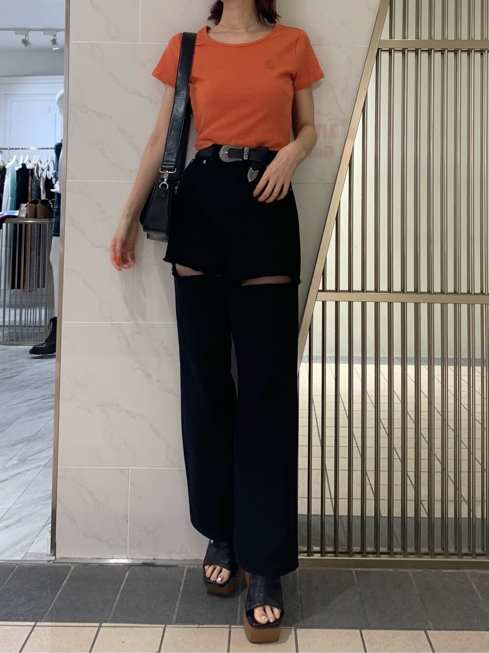 EVRISらしさが詰まったカジュアルデニムコーデ☀︎【トップス】伸縮性が高く着心地抜群✌︎今季トレンドのおへそ上のクロップド丈で1枚で重宝するアイテムです!胸元のEVRISオリジナルのサニーモチーフがポイントに☀︎ 【ベルト】EVRISで大ヒットロングセラーアイテム❤︎スタッフ全員リピート買いしている程多用使い出来ます!【デニム】高めな位置に入った横スラッシュデザインが自然と脚長効果を発揮してくれます!ワイドシルエットですがEVRIS特有のウエスト周りがギュッとタイトめなのでメリハリ良く綺麗に仕上がります✴︎【シューズ】EVRISらしいバッグルデザインがエッジが効いててカッコ良いですよね❤︎アッパー裏はクッション仕様になっており、靴擦れ防止!11cmヒールですが、ウェッジソールの為安定感抜群です!【バッグ】ショルダーとクラッチの2wayで使い回し可能です❤︎底がくぼんだデザインなのでクラッチ使いの際、手へのフィット感◎ 【ネックレス】華奢なデザインですが、輝き方が強めなので首周りが華やかに..❤︎