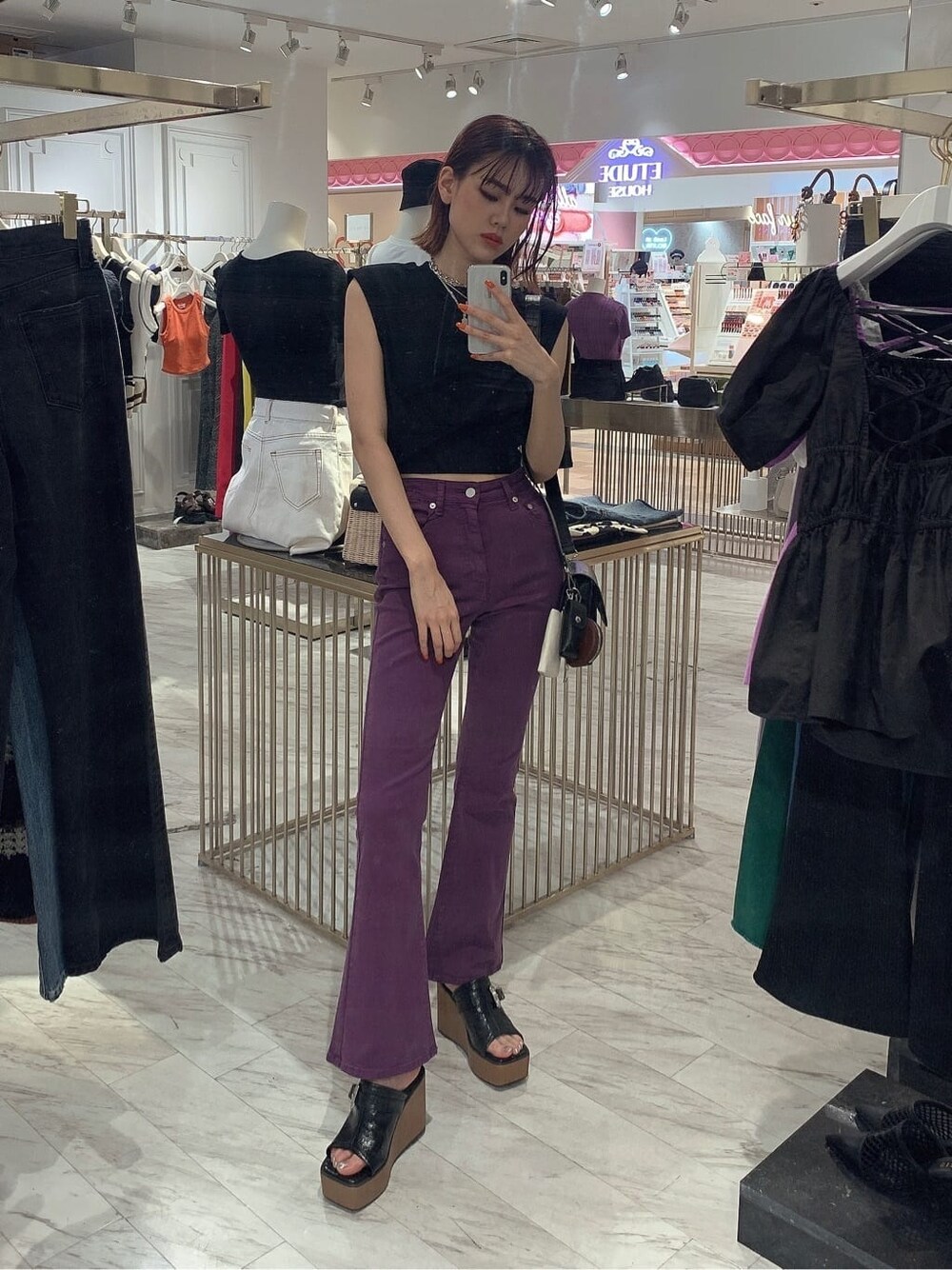 カラーデニムを主役としたエッジコーデ❤︎【トップス】トレンドのパワーショルダーでシンプルながらもこなれ感UP❤︎肩パッドは取り外しが可能です◎【デニム】太ももの着痩せ効果が絶大に発揮出来るデニムが登場!!デニムですが履き心地も柔らかくて楽チン❤︎トレンドカラーの3色展開です✴︎ 【アクセサリー】EVRISでロングセラーアイテムのネックレス❤︎3連が1つに繋がっている為、時間短縮で着用でき華やかに仕上がります!【シューズ】EVRISらしいバッグルデザインがエッジが効いててカッコ良いですよね❤︎アッパー裏はクッション仕様になっており、靴擦れ防止!11cmヒールですが、ウェッジソールの為安定感抜群です!【バッグ】ミニポーチが3つも付いたショルダーバッグ❤︎中も大きめなポケット付きで収納力もバッチリです!