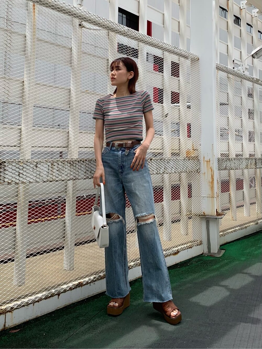 大人カジュアルなデニムコーデ❤︎【トップス】しっかり目な生地感です!EVRISっぽい配色がポイントで子供っぽくならずにボーダーを取り入れられます❤︎骨盤上の着丈です!【デニム】ヴィンテージ感漂う加工がこれ1本でお洒落に仕上がります❤︎従来のEVRISのワイドデニムシリーズと比較し着丈が長めです!166cmでSサイズ着用でかかと覆うくらいの丈感です☺︎【シューズ】EVRISらしいバッグルデザインがエッジが効いててカッコ良いですよね❤︎アッパー裏はクッション仕様になっており、靴擦れ防止!11cmヒールですが、ウェッジソールの為安定感抜群です!【ベルト】EVRISで大ヒットロングセラーアイテム❤︎スタッフ全員リピート買いしている程多用使い出来ます!【バッグ】今季トレンドの横長ハンドバッグは持つだけでお洒落度UPアイテム❤︎中にはポケットが2箇所付いてあるので収納も便利!