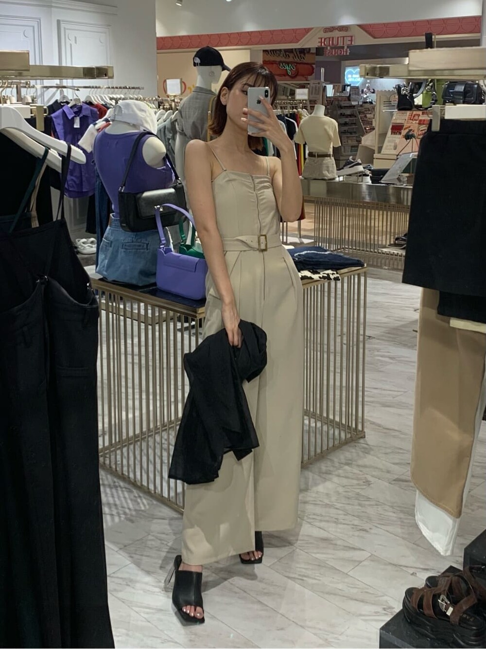 スタイルアップオールインワンコーデ❤︎【オールインワン】ボディラインにフィットするデザインでスタイルアップ効果◎肩紐のストラップとウエストのベルトは取り外しが可能です!前ファスナー且つ背中がシャーリングゴム仕様になっているので着脱も楽チンです✌︎【シャツ】去年のリバイバルアイテム♡透け感がかなり強めなシアーなので長袖でも真夏へっちゃらです!166cmで裏太ももまでカバー出来るオーバーサイズです!【シューズ】中敷きが柔らかいクッションになっており、履き心地抜群❤︎8.5cmヒールで日常使いにも最適です!24cmでLサイズを着用してます!