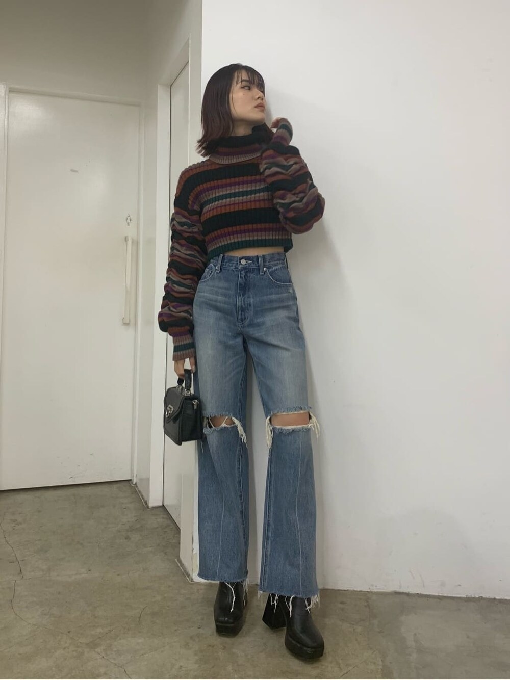 柄ニットが主役コーデ❤︎【ニット】トレンドのマルチボーダー柄は1枚でインパクト抜群✌︎お袖のたっぷりと入ったギャザーがボリューム感あってイチオシポイントです❤︎着丈は骨盤上のショート丈でハイウエストボトムと合わせるとバランス良く着れます!【デニム】ヴィンテージ感漂う加工がこれ1本でお洒落に仕上がります❤︎従来のEVRISのワイドデニムシリーズと比較し着丈が長めです!166cmでSサイズ着用でかかと覆うくらいの丈感です☺︎ 【バッグ】表面が全面クロコライクデザインで高見えします✴︎マチもしっかりめで収納力も◎ハンドとショルダーの2wayでお使い頂けます☺︎ 【シューズ】EVRISでベストセラーアイテム✴︎10cmヒールですが、傾斜が緩やかなので足疲れもほとんどなく、安定感も抜群です❤︎