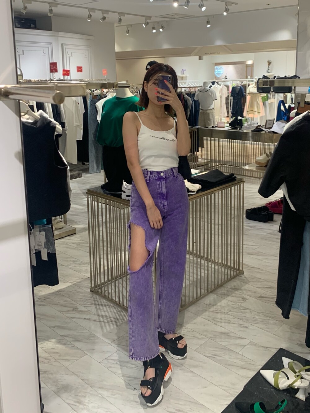 猛暑日コーデ❤︎【トップス】WARNER BROTHERSコラボレーションのキャミソールです⭐︎パッド付で下着無しでそのまま着用可能です◎【デニム】太ももに大胆クラッシュが入っておりインパクトある一本✴︎全体的に細身なワイドシルエットです!【バッグ】今季トレンドのナイロン素材を使用しており、コーデのアクセントになります⭐︎【シューズ】過去にバズったサンダルが10周年を記念に復刻致しました✴︎厚底とは思えない程軽量で足に負担なく履けます!
