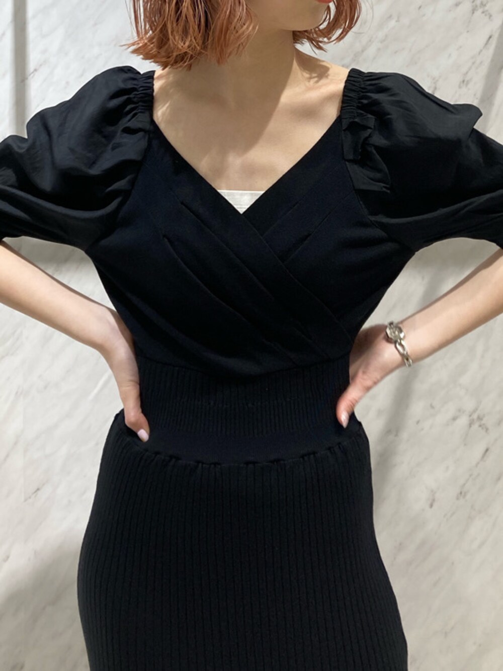 大人のニットワンピコーデです♡お袖のパワショルとデコルテが綺麗に見えるカシュクールデザインがポイントです☝︎ラインも出ずにオシャレに二の腕が隠せます!サラッとしたニット素材で柔らかく、腰回りもピタッとしすぎない為骨盤が気になる方も挑戦して頂きやすいシルエットとなっております。春〜秋まで着用出来るので1枚あればいざという勝負の日に大活躍しますよ♩
