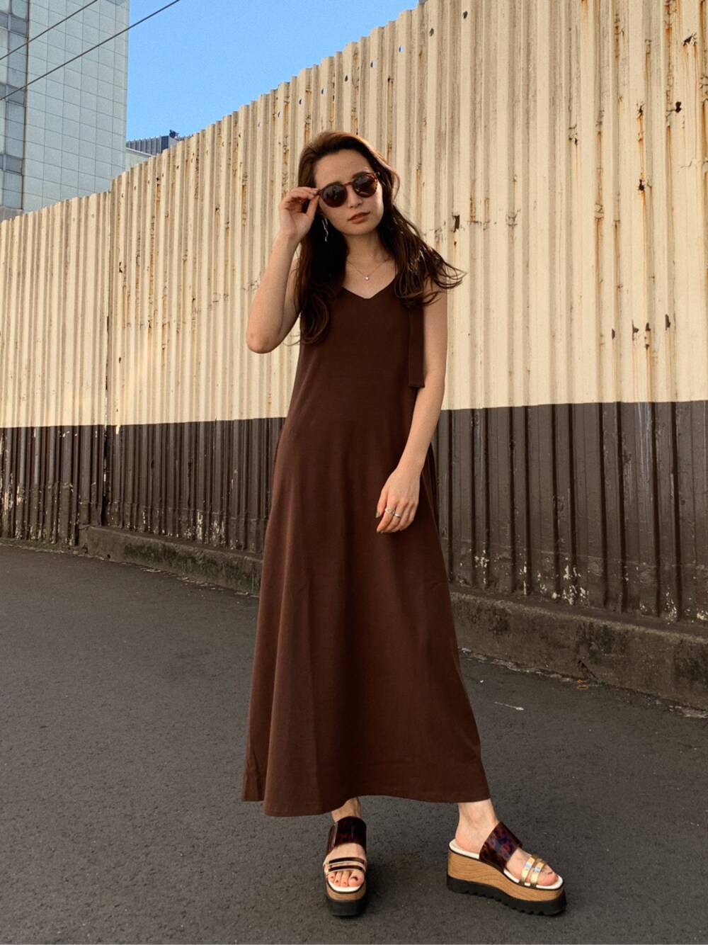 1枚で楽ちんなコーデ! デコルテラインやバックスタイルが肌見せできるので、見た目はカジュアルそうに見えても女性らしく着られちゃいます✨
