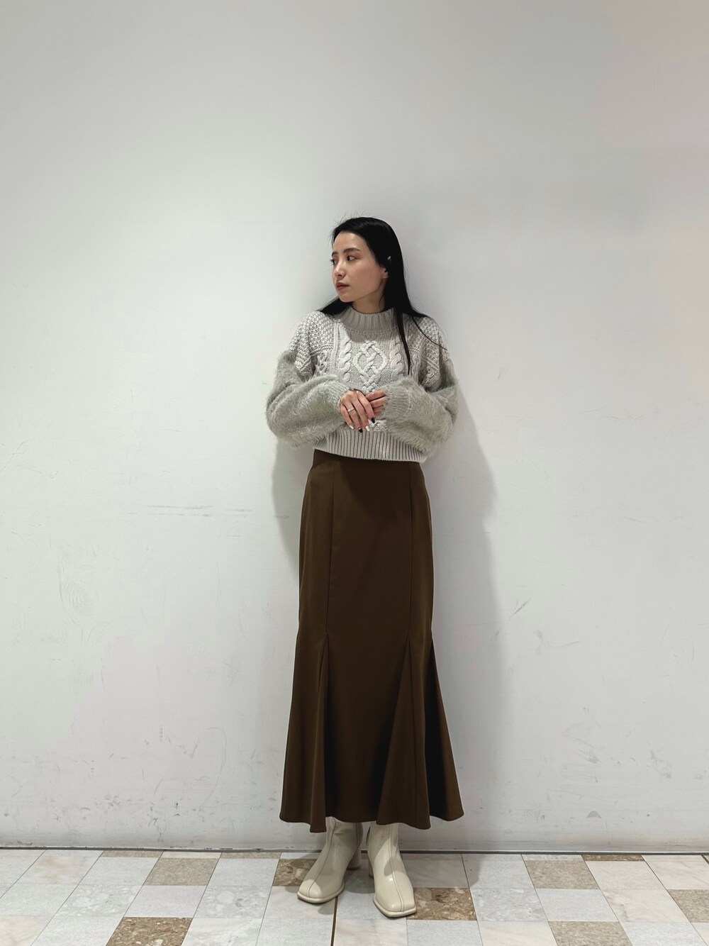 ワントーンコーデ👗 ニットは、特に袖のファーがかなり特徴的✨ファーの部分は、ふわふわしていてとても肌触りがいいです🌟 腕周りは、かなりゆったりになってるので二の腕など気にされる方でも気にせずお使いいただけます! スカートは、ムルーアといえばお馴染みぐらい大人気のマーメイドスカート! 後ろにスリットが入ってるので、見た目以上に足捌きがいいのでとても快適です☺︎ また、ハイウエストなので脚長効果抜群です☺️