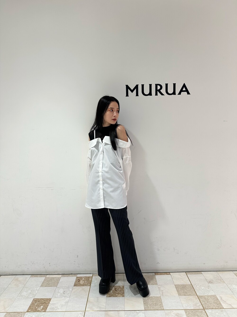 モードカジュアルコーデ! シャツ☞ムルーアらしい、デザインシャツ。 インナーのタンクとセットになっているので、別々で着回しも出来ます✨ オフショルのデザインシャツが、女性らしい雰囲気に❤︎ 156センチの私で、腰回りまですっぽり隠れるくらいの着丈でした! パンツ☞トレンドのリングパンツ。 ハイウエストなので、脚長効果抜群✨ ストライプのデザインが、コーデのアクセントになります! 156センチの私で、足首位の着丈でした。 ブーツ☞毎年即完する大人気ブーツ👢 厚底ながらも、見た目以上に軽いです✨ 実際に、店頭で履いていても軽いので歩きやすく疲れにくいです! 普段、24.5(37)サイズの私でぴったりでした! まだ、気温が高いので秋服に抵抗があると思うので、足下から徐々に秋物取り入れていきましょう〜🍂☺️