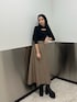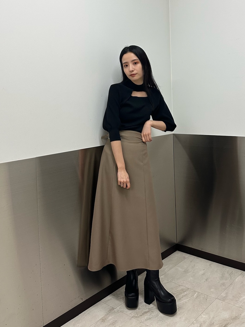 きれいめコーデ! トップス☞ムルーアらしい、デザイントップス!パフニットなので、気になる腕周りをカバーしてくれます。胸元の開き具合は、深すぎないので安心して1枚で着て頂けます✨ ニット生地なので、アウター着る前まで長く着れます☺︎ スカート☞美シルエットフレアスカート! ハイウエストなので、脚長効果抜群⭕️ サイドベルトで、ウエストの調節も可能。 156センチの私で、足首位の着丈でした。 ブーツ☞毎年大人気厚底ブーツ👢 高さが、10センチ程ありますが見た目以上に軽くソールの高さも一定なので歩きやすいです。 普段、24.5(37)サイズの私でぴったりでした♪