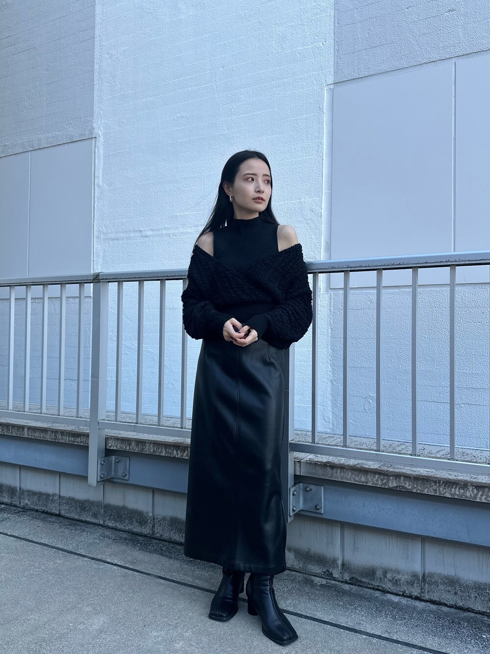 きれいめデートコーデ! ニット➡︎これからのイベントにぴったりのオフショルニット🧶 肩出しが、女性らしい雰囲気に︎❤️ 黒色✖️パープルラメだと甘すぎない為大人っぽい印象に! 着心地の良い柔らかいニットなので、1枚でお使い頂けます。 156センチの私で、骨盤位の着丈です。 スカート➡︎お問合せ多数のレザースカート!360℃好きな位置でスリットが作れる優れもの🌟 私は、横スリットが好きなので横スリットで着用してます。 レザースカートなので、伸縮性がなくボディーラインが出やすいのでオーバーサイズのニット合わせなどオススメです✨ 156センチの私で、Sサイズを着用していて骨盤周りはピッタリめで足首位の着丈でした!