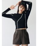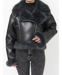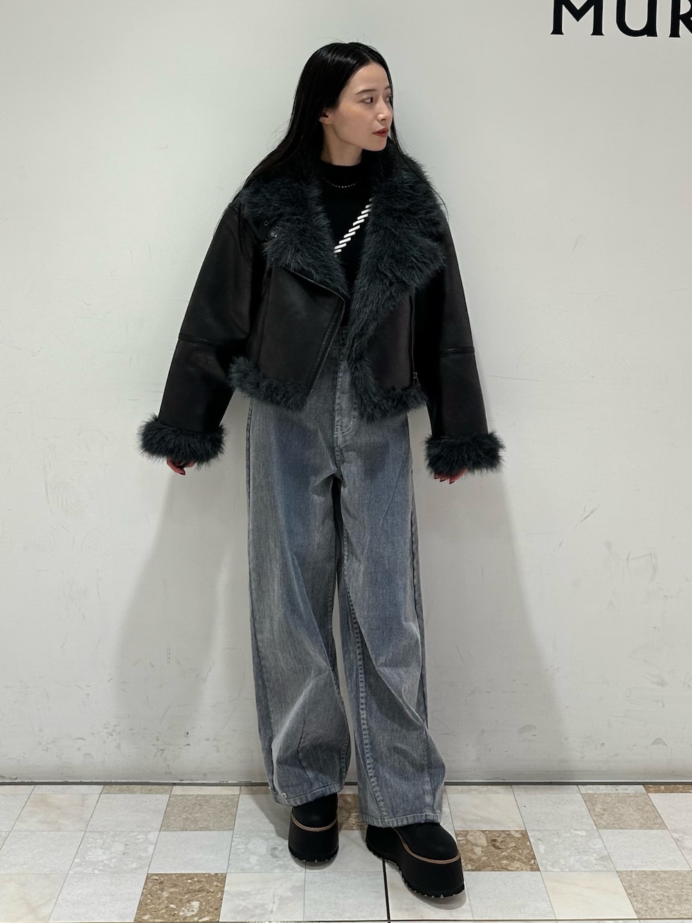 アウター→ムルーアといえば、ムートン!今年も大人気間違いなしのムートン! 去年と比べ、柔らかいフェイクファーを使用しているのとムルーアらしいカラーが特徴です🌟 私が着用している、黒もフェイクファーは少しグリーンが少し混じったような色味で他と被りにくい1品です! また、見た目以上に軽いのも嬉しいポイント! ずっと羽織っていても、肩こりしないで過ごせます。 トップス→ムルーアらしいデザイントップス。 大きなステッチデザインが、コーデのポイントに!1枚で着ても主役になれるアイテムです。 デニム→フロッキー加工使用している、今季イチオシデニム!ベロアのような、ずっと触っていたくなります。程よく光沢感もありるので、高見えします。ムルーアのは、裾にボタンがついてる為シルエットを変化出来るのも嬉しいポイントです。 シューズ→大人気の厚底ブーツ!ムルーアのはほんと軽いので、店頭8時間たっていても疲れにくいです!レースアップのデザインが施してあるので、ミニスカやワンピースなどに合わせてもかわいいです。