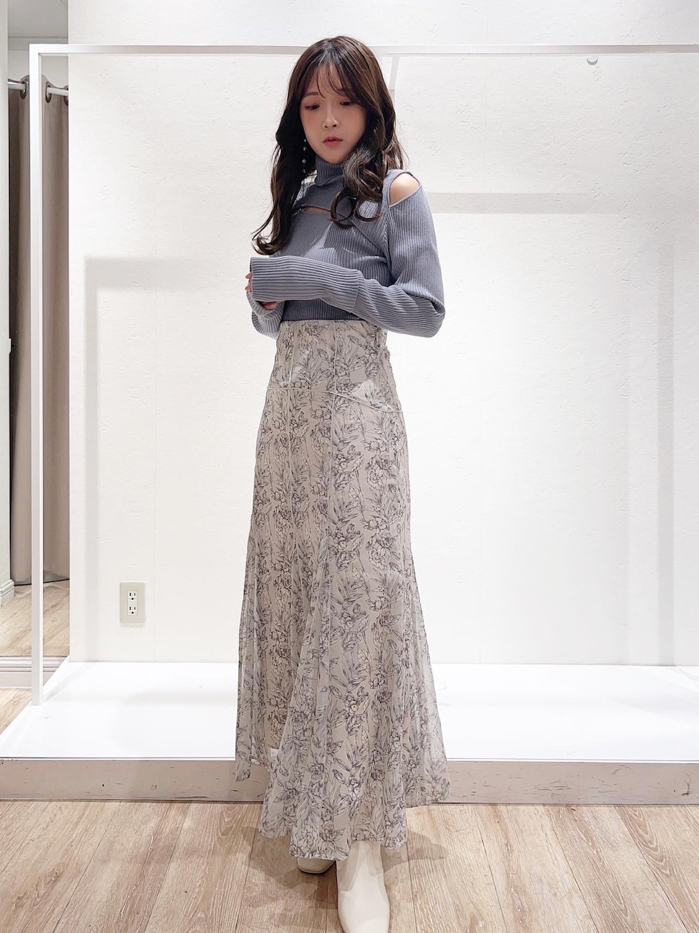❝ 骨格ウェーブなの?!❞ って思うくらい細見えするコーディネート 前後2wayで使えるニットトップス! タートルニットは今まで苦手意識でしたがヘルシーな肌見せできるスリット部分があり逆に着たい!!という気持ちになりました𖥧𖥣𖡡𖥧𖤣 カラーも新色のブルー着てみました! お顔周り透明感出してくれて1番おすすめカラーです♡ mercuryduo オリジナルのフラワープリントにパイピングの切り替えがポイントのスカート♡ 花柄のスカートは沢山あるけど ちょっと物足りないという方に おすすめしたい一枚!! シルエットもハイウエスト+お尻や腰回りをキュッと見せてくれる嬉しいアイテム☺︎ 普段アイボリーという膨張色に 挑戦できないですがこのスカートなら チャレンジしたくなるような形です!