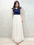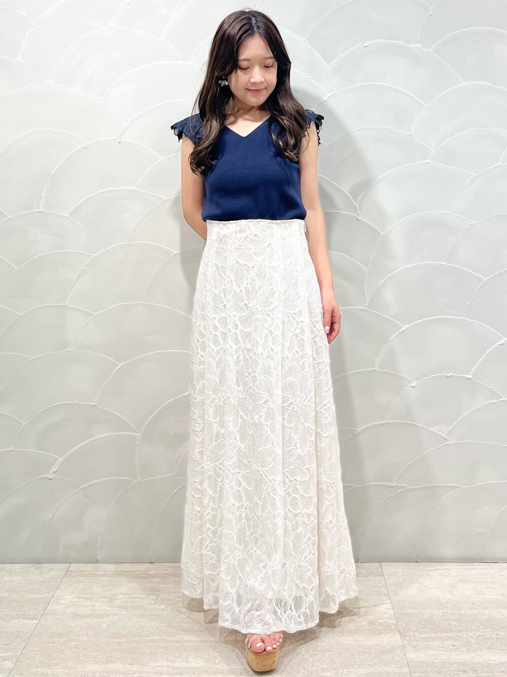 身長148cm/Mサイズ着用 [トップス] 肩のカットワーク刺繍がポイントのニットトップス お袖が長めになっており二の腕もおしゃれにカバーしてくれます! 前後2wayで使えてデコルテ周りもスッキリ見えますよ♡ [スカート] 大花柄のレースが大人かわいく見せてくれるデザインに! シルエットもとても綺麗で腰回りをスッキリと見せてくれます♡ バックもゴムになっており伸縮性も抜群!