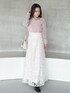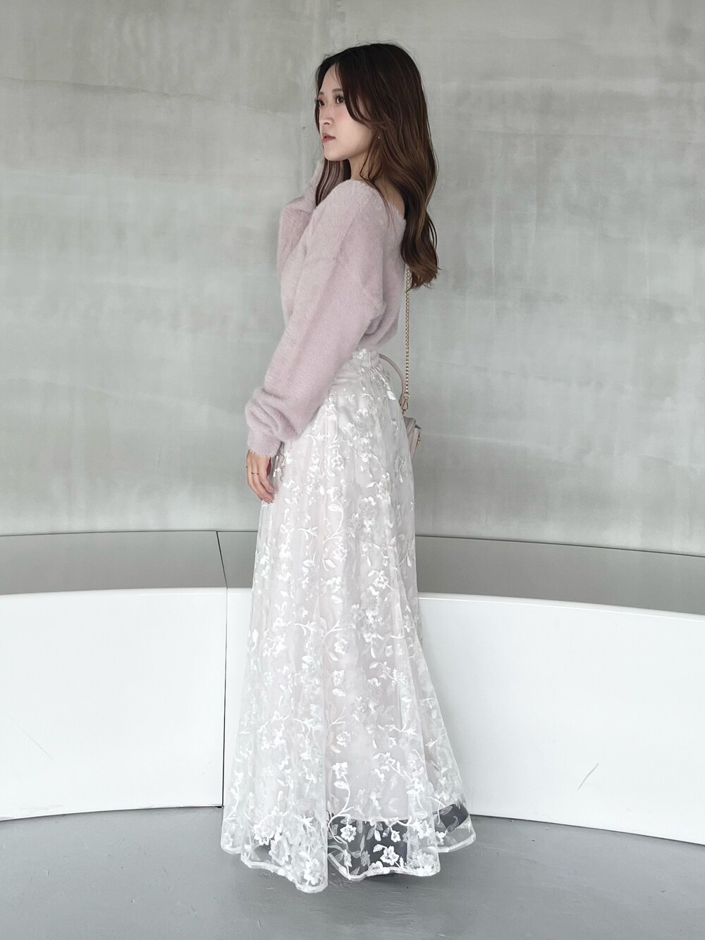 【トップス】 つい触りたくなるような毛足のふわふわ感と、その肌触りがやみつきになるミニシャギーニット♡ ゴールドのネックレスがキラッと輝きアクセントに! ネックレスは取り外し可能で、前後どちらでもつけて頂ける仕様です! 【スカート】 花柄レース生地にキラキラと光るスパンコールが施されたトレンド感のあるスカート♡ 腰回りもすっきり見えるデザインで 骨格ウェーブには嬉しいシルエットに! シンプルだけどスパンコールが 華やかに見える大人かわいいデザイン♡