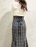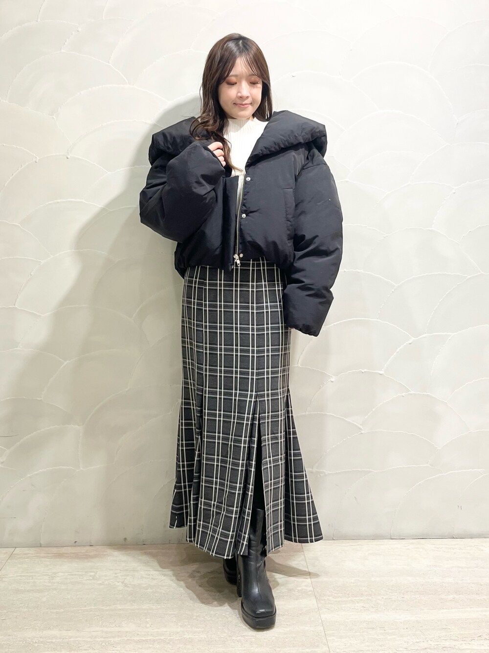 身長148cm/Sサイズ着用 【アウター】 ショールカラーがポイントで、大きな衿で小顔効果抜群な中綿アウター♡ 深めのVネックが抜け感と女性らしさを演出してくれますよ! スタイリングしやすいショート丈は、着回し力抜群のアイテムです♪ 【トップス】 一見シンプルなリブタートルニットですが、袖口がフレアになったトレンドライクなアイテム♡ 袖口にはスリットと、その上にパールがあしらわれており、普段の何気ない動作で目に留まり、華やかさを増してくれますよ♪ 【スカート】 大人気スカートが再入荷♡ ハイウエストと美しいマーメイドシルエットでスタイルアップ効果抜群のスカート! バックシャーリングのレースアップデザインなので、よりお好みのフィット感で着用ができる嬉しいアイテム♪ 身長148cmでMサイズ着用しておりますが、足首下の丈感になるのでSサイズがおすすめです!