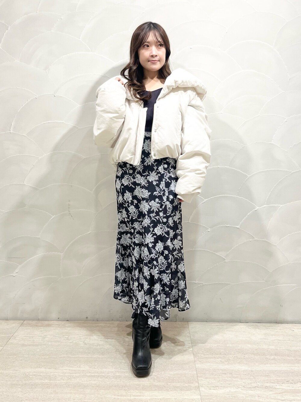 身長148cm/Sサイズ着用 【アウター】 ショールカラーがポイントで、大きな衿で小顔効果抜群な中綿アウター♡ 深めのVネックが抜け感と女性らしさを演出してくれます! スタイリングしやすいショート丈は、低身長の私でも着回し力抜群のアイテムです♪ 【トップス】 程よいフレア感が上品な女性らしいラッフルニット♡ デコルテをキレイに見せてくれるネックラインと、さりげなく腕周りをカバーしてくれるラッフルが、より華奢な印象を与えてくれます! 【スカート】 オリジナルフラワーのスカート♡ 腰回りがすっきりとしたハイウエストデザインが女性らしく華やかなシルエットを実現させています! とにかく動いたときの裾の揺れ感が可愛いスカートです♪ 身長148cmでSサイズ着用してますが、足首上の丈感で丁度良い丈感でしたよ♡
