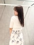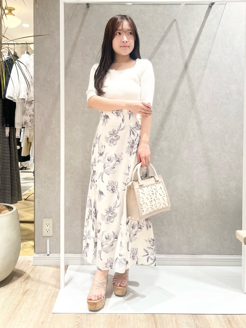 148cm/Sサイズ着用 【トップス】 デコルテをすっきり見せてくれるスクエアネックデザインに、衿周りにパールをあしらったコンパクトニット♡ アクセサリー無しでも、パールがあることでお顔周りをパッと華やかに演出してくれます♪ 【スカート】 水彩タッチの柔らかい雰囲気の花柄が女性らしいセミフレアースカート♡ 腰から裾にかけて入った細パイピングがデザインポイントで、スタイルアップして見せてくれます! 身長148cmで、Sサイズ着て足首の丈感です♪