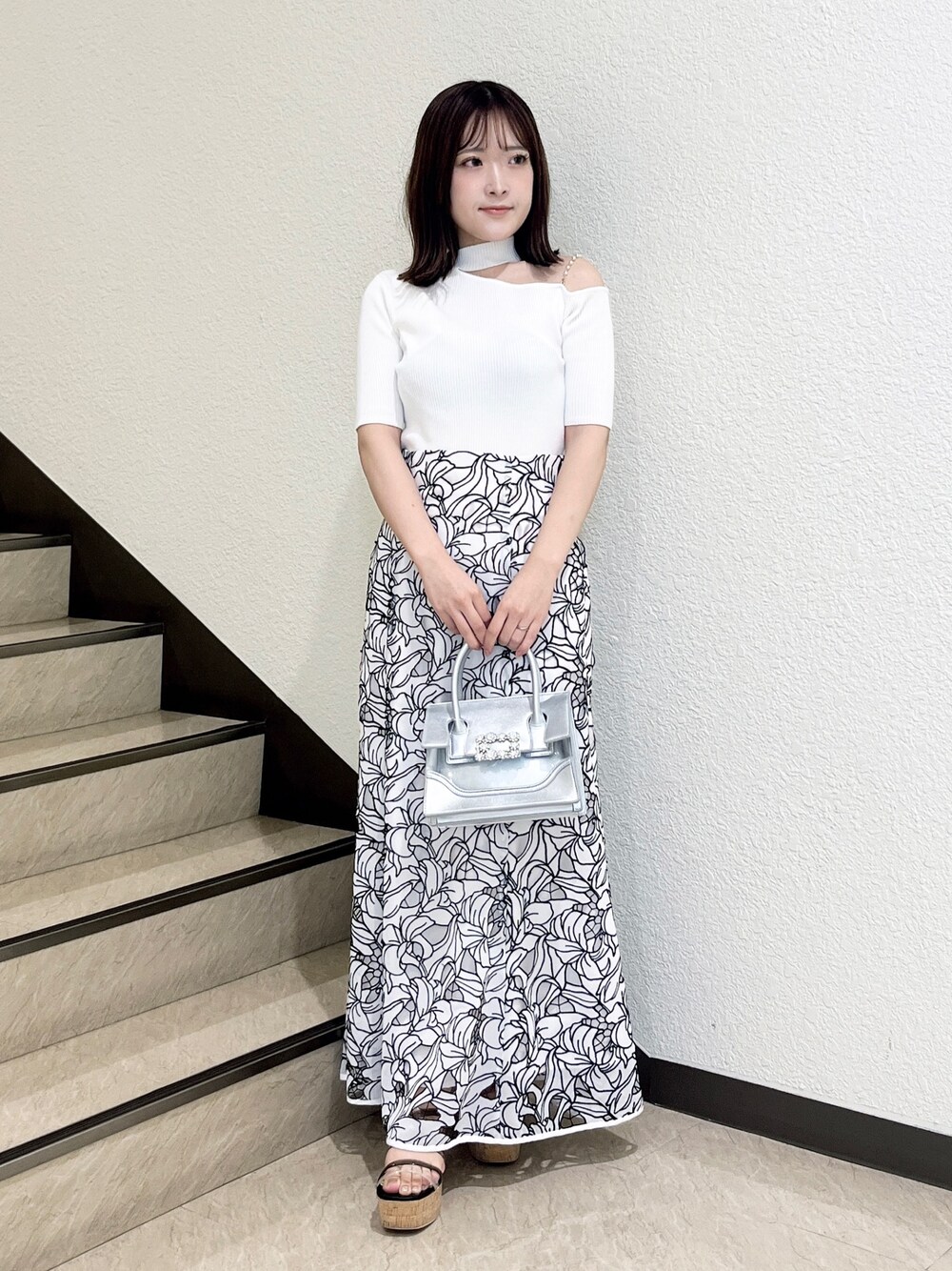 \ 夏のホワイトコーデ♡ / 夏らしい爽やかな大人ホワイトコーデ☺︎ トップスは、肩の部分にスリットが入っており大人の肌見せが叶うアイテム! スカートは、セミフレアのシルエットなので骨格ウェーブに優しい骨盤を消してくれる!美シルエットスカートです♡ カットワークの刺繍で腰回りをカバーしてくれるので着痩せして見えますよ☺︎
