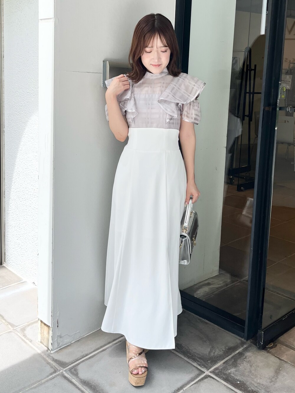 【ワンピース】 ハイウエストの切り替えでスタイルアップが叶うワンピース♡ シアーチェックにさらっとした生地感のスカートはセミマーメイドシルエットで、腰回りをスッキリ見せてくれます♪ 肩の部分は2wayで、オープンショルダーでも着れるので二の腕もカバーしてくれますよ! 身長148cmでMサイズ着ておりますが、足首より下の丈感で着たい方はMサイズがおすすめです♡ スリットも入っているので、小柄な方でも重すぎずに着れますよ! 【バッグ】 ワンピースのお色味が綺麗めカラーなので、大人っぽくまとまるシルバーのカラーバッグにしてみました☺︎ チェーン付きで斜めがけにもできます! 両端には、ファスナーが付いておりマチを広げられるので1番下の底に500mlのペットボトルが入りますよ! 【シューズ】 ワンピースをMサイズで着用しているので、安定感のある厚底サンダルで合わせてみました♡ 個人的に4色展開の中でも目を惹くこのカラーがおしゃれ見えするので、足元まで可愛いコーデが叶えられますよ☺︎