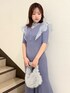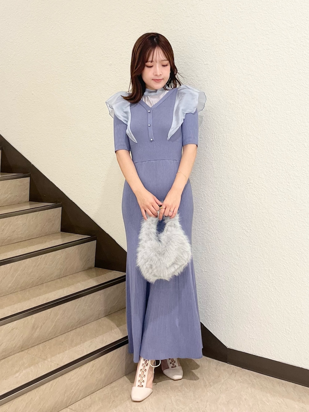 【ワンピース】 前後2wayで着れるニットワンピース♡ 軽やかなシアーラッフルと、シアーブラウスをレイヤードしたような デザインがポイントのアイテム! 身長148cmでMサイズを着て 足首より下の丈でしたのでSサイズをおすすめします☺︎ 【バッグ】 トレンド感のあるファーバッグ チェーンが付いているので、お出かけの際は肩掛けにしても◎ ワンピースのカラーと合わせて寒色カラーでまとめてみました♡ 【ブーツ】 レースアップのメッシューブーツは、 履いていただくだけで華やかに おしゃれにコーディネートがまとまります!