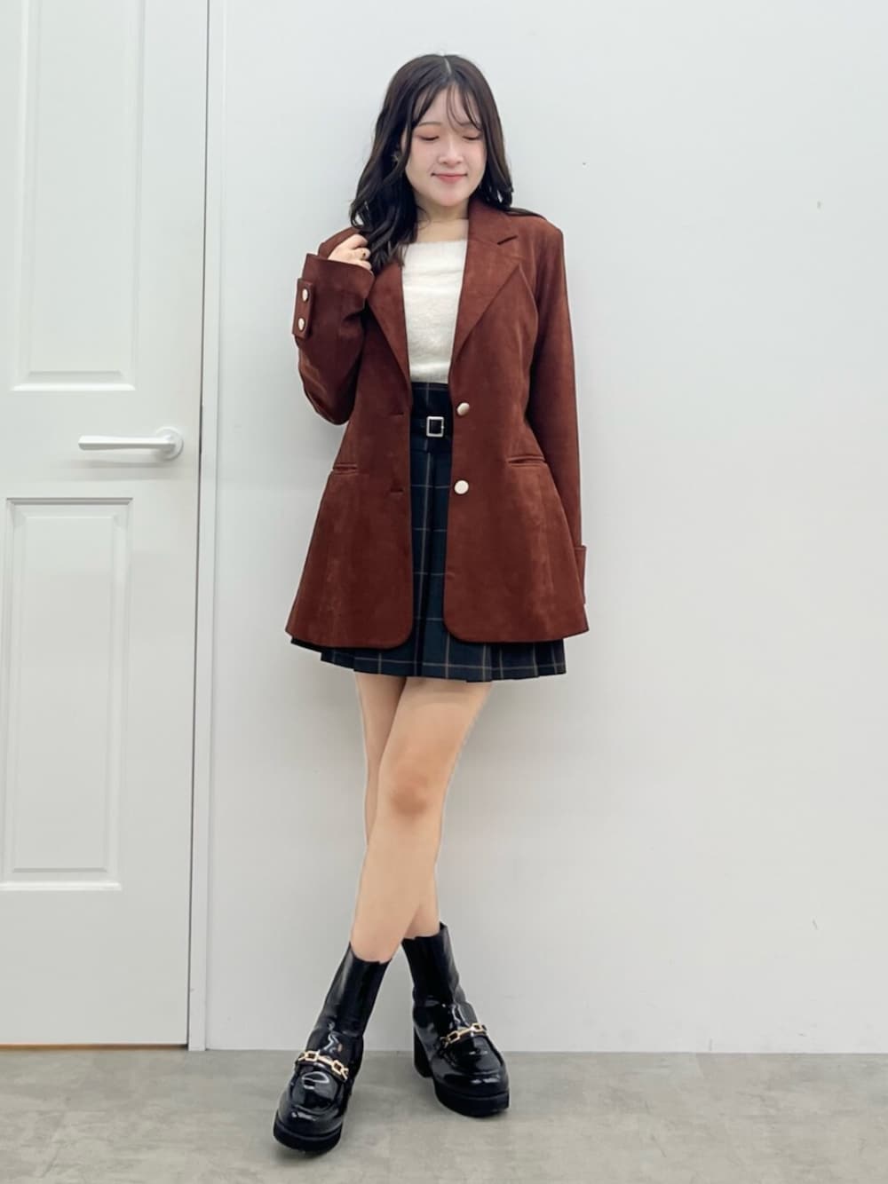 【ジャケット】 スエード素材のジャケット🧥 ウエスト周りがくびれるシルエットになっていてスタイルアップして見えます! 【スカート】 ベルト付きのチェックスカート♡ ミニ丈でもインナーパンツ付きなので安心して着ていただけますよ👌