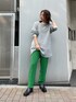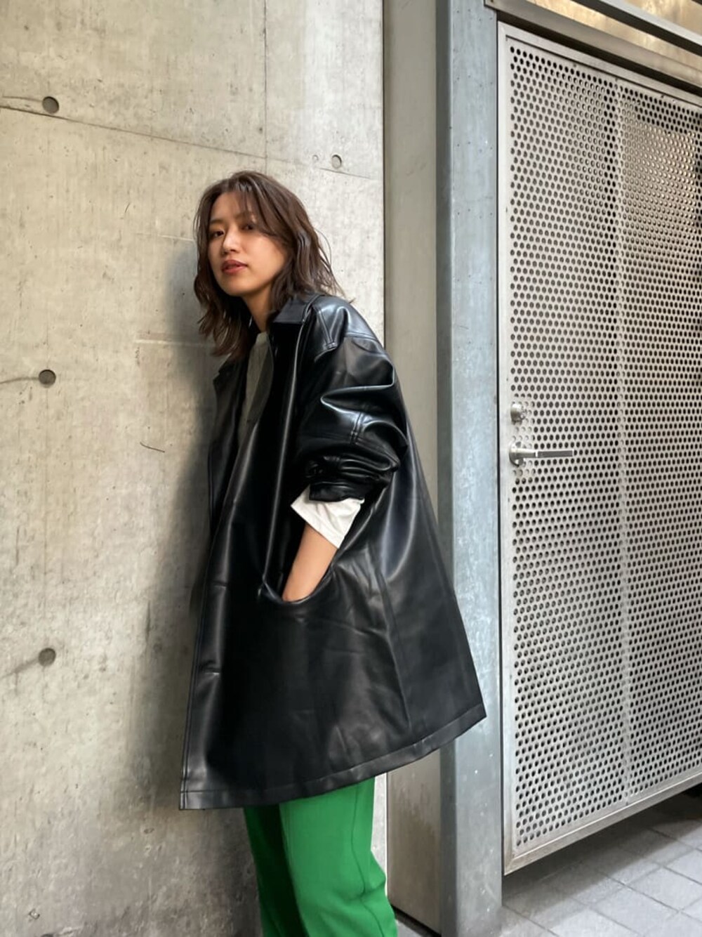 オーバーサイズのレザージャケットは生地感が柔らかくて見た目より重くないので羽織りやすいです。メンズぽくなりそうな時は小物などどこかに女性らしさを入れたいですね!