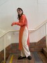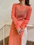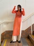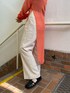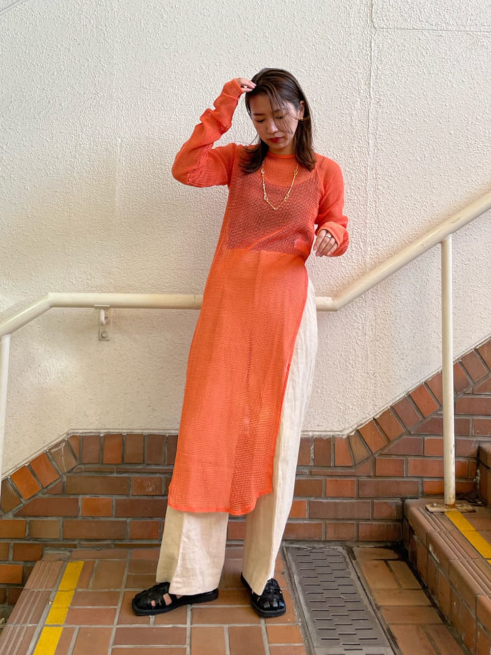 【one-piece】メッシュワンピはオレンジでカラーを効かせてお洒落見えの印象を。個人的にはボトムは太めパンツの方がかっこよく見えるかなと思いチョイス。今なら羽織りはジャケットやステンカラーコート、ミリタリー系がしっくりくると思います!【pants】リネン混のパンツは後ろがゴムで履きやすく、ベルトループは付いていないのでウエストをすっきり見せてくれます。さらっと履いて頂ける素材感で楽で動きやすさもあり一度試してほしいです。