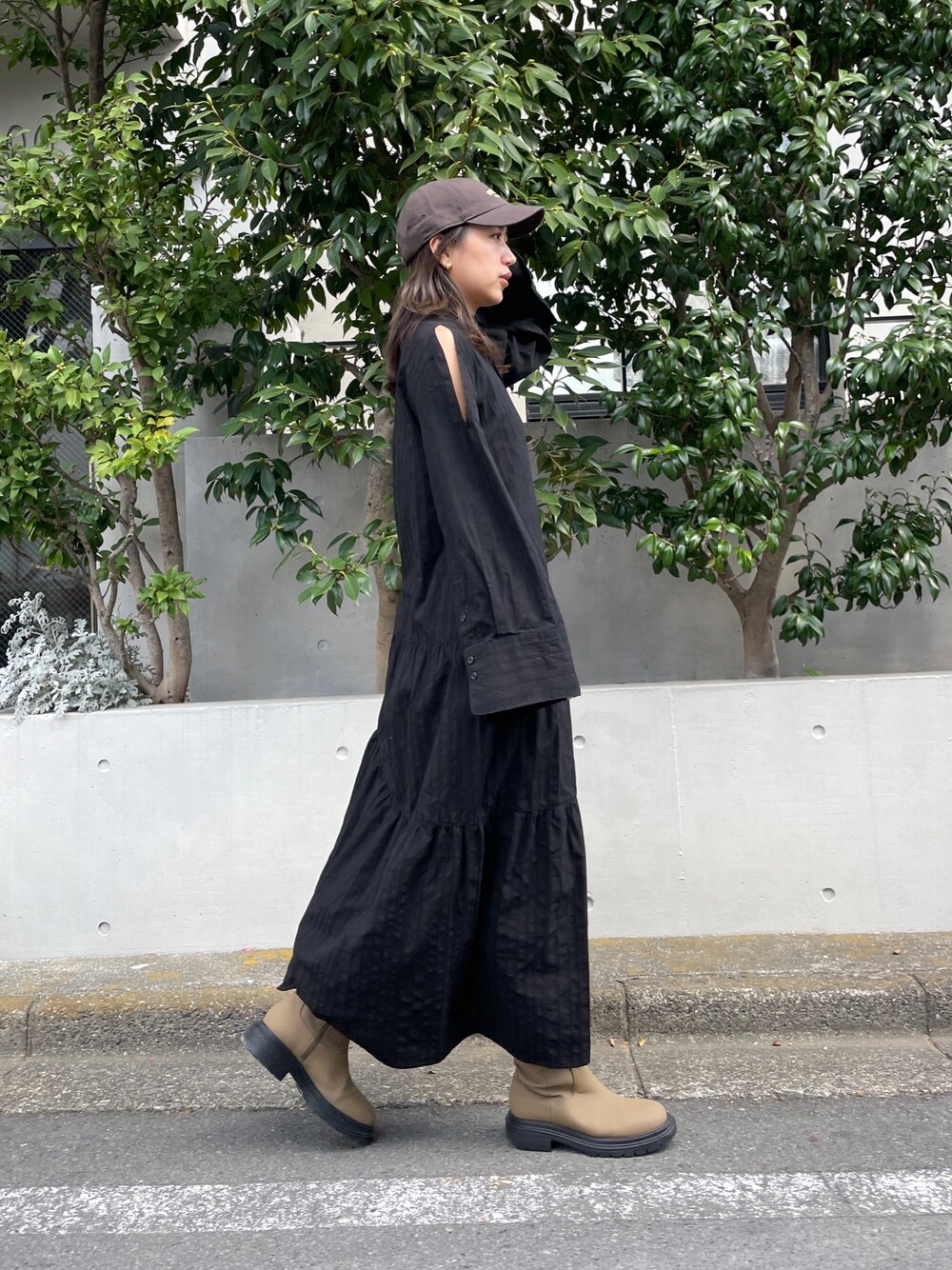【onepiece】肩の部分にスリットが入っていて程よい肌見せで女性らしさが出せるワンピース。フロントにはボタンが付いているので前開きも可能。ティアード切替になっているのでレディライクな印象。個人的に甘くなってしまうので小物でカジュアルダウンしたバランスが◎ 【shoes】ボリュームあるブーツはワンピースやスカート合わせにおすすめ。トレンドのトラックソールのブーツは一足あると使えますよ♡