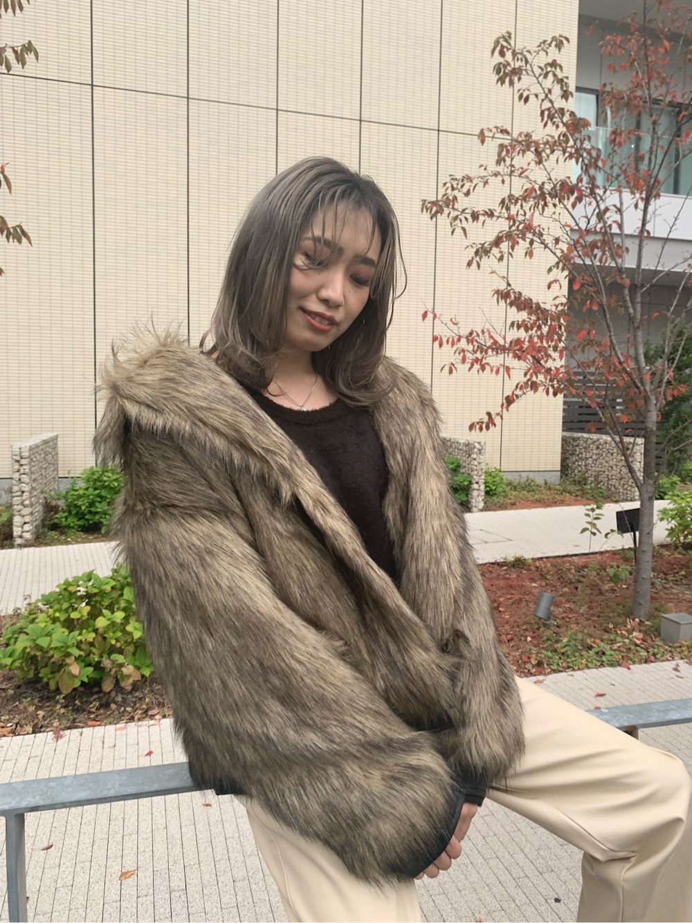 MIXカラーのフェイクファーを使用したファーコート♡袖や裾にレザーが施されていておしゃれ感出してきて頂けます!腕周りもゆったりで中に着込んでもゴワゴワせず着れちゃいます!フェイクレザーのパンツもストレートタイプで形がすごく綺麗で脚長効果抜群!バックスタイルが可愛すぎるニットでチラッと肌見せさせ、女性らしさも取り入れてみました♡