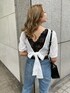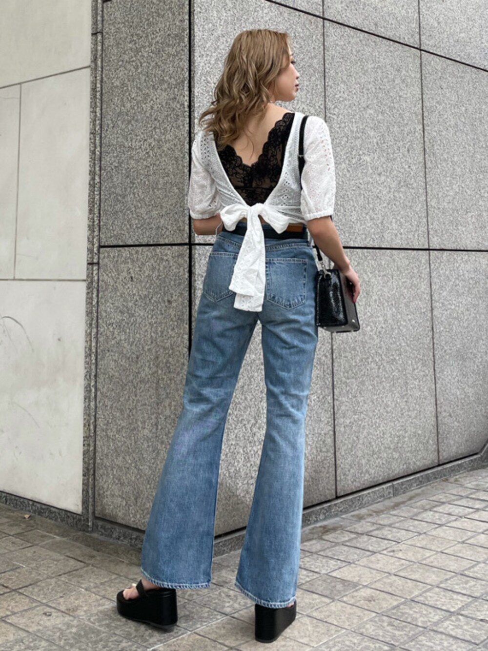 背中の大胆な肌見せが可愛いブラウスコーデ♪パット付きなので、下着も気にせず1枚でも着用できるのが嬉しいポイント♡背中のリボンでウエストのサイズ感も調節できるので、少しキツめに結んでウエストマークして着るとメリハリが出てオススメです☑︎コットンレースで少し甘めな印象になるので、黒のインナーを合わせ甘すぎない印象にし、デニムでカジュアルさを出しました!インナーを合わせると肌見せに抵抗がある方も挑戦しやすいですよ♡デニムは程よくフィット感があり履きやすく、フレアシルエットなのでトレンド感も出せます♪ハイウエストでショート丈のTOPSとも相性が良く、ポケット位置が高めなので、ヒップアップ効果もあります♡足元にトングサンダルを合わせることで夏っぽさもプラス♡ シルエットが広がりすぎず、ぴったり感も少ない、丁度良いフレアデザインで形がすごく綺麗なデニムなので、Tシャツ✕デニムのシンプルな鉄板コーデもおすすめです★ バッグはさりげないパイソン柄が幅広いコーデに合わせやすく、マチがしっかりで容量も抜群です!小物やシューズなどをインナーと同じ黒で統一し、まとまりあるコーデにしました♪